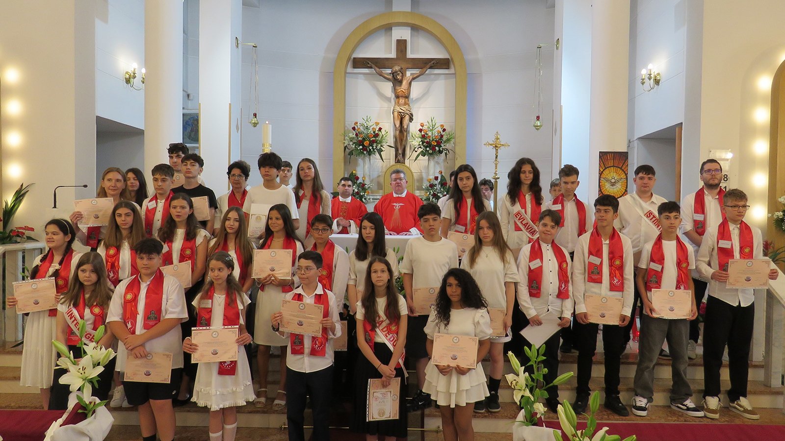 Sâmbătă, 7 iunie, în cadrul Jubileului candidaților la Taina Sfântului Mir, tinerii din Parohia noastră au primit Sacramentul Mirului în Catedrala „Sfântul Iosif”, alături de alți candidații din 15 parohii ale Capitalei și din unele parohii limitrofe. Astăzi, în duminica Rusaliilor, ei au participat în biserica parohială la Sfânta Liturghie de la ora 11:00 pentru a-i mulțumi lui Dumnezeu, împreună cu întreaga comunitate, pentru darul Duhului Sfânt.